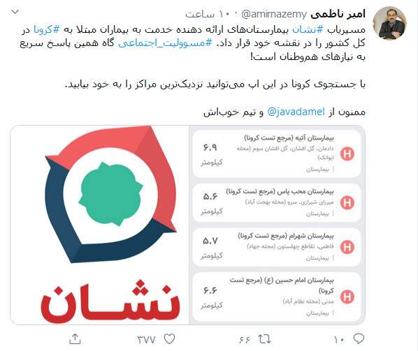 میتوانید با مسیر یاب نشان و درج عبارت کرونا در بخش جستجوی این مسیریاب بومی، نزدیکترین بیمارستان و یا مرکز درمانی که تست اولیه کرونا در آن انجام شود را پیدا کنید. در کنار نشان، مسیریاب بلد نیز اقدام به نمایش اطلاعات مراکز درمانی که خدمات مربوط به ویروس کرونا را ارائه میدهند، کرده است.
