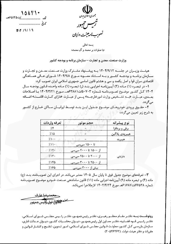 هیئت وزیران در جلسه ۱۴۰۴/۹/۱۲ به پیشنهاد مشترک وزارت صنعت، معدن و تجارت و سازمان برنامه و بودجه کشور و به استناد مصوبه مورخ ۱۴۰۴/۹/۸ شورای عالی هماهنگی اقتصادی سران قوا و اصل یکصد و سی و هشتم قانون اساسی جمهوری اسلامی ایران تصویب کرد: