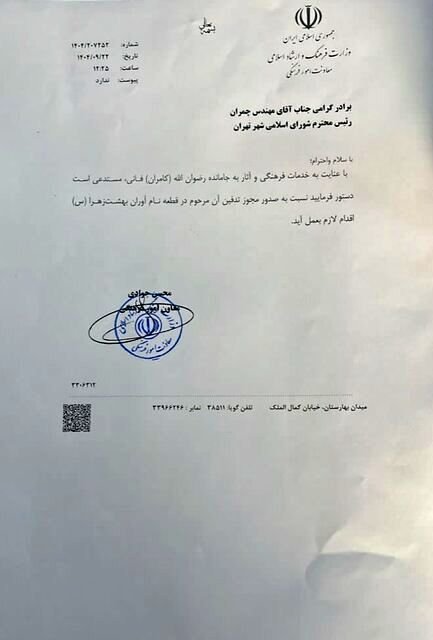در حالی که قرار است مراسم تشییع و خاکسپاری کامران فانی فردا (دوشنبه، 24 آذر) از محل سازمان اسناد و کتابخانه ملی به سمت بهشت زهرا برگزار شود و طبق اعلام پیشین، قطعهنامآوران به عنوان محل خاکسپاری او اعلام شده بود، حالا خبر رسیده که شورای شهر تهران با خاکسپاری این چهره پیشکسوت فرهنگی در این قطعه مخالفت کرده و حتی رایزنی محسن جوادی - معاون فرهنگی وزیر فرهنگ و ارشاد اسلامی - هم در این زمینه نتیجهبخش نبوده است.