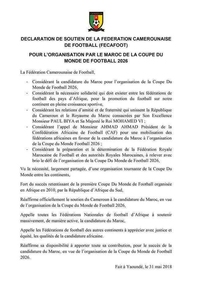 اخیرا کشور کامرون هم طی نامه ای رسما حمایت خود را در خصوص میزبانی مراکش در جام جهانی 2026 اعلام کرده و به جمع کثیری از دیگر کشودهای آفریقایی پیوسته است. کامرون و الجزایر جزو کشورهایی بودند که با توجه به برخی مشکلات سیاسی، انتظار می رفت تن به حمایت از مراکش ندهند اما سرانجام این اتفاق افتاد و دو کشور مهم آفریقایی حاضر به حمایت از کاندید آفریقایی میزبانی جام جهانی شدند.
