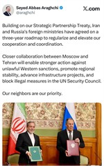 وزیر امور خارجه گفت: بر مبنای معاهده مشارکت راهبردی میان ایران و روسیه، وزارتخانههای امور خارجه دو کشور بر سر یک نقشه راه سهساله به توافق رسیدند تا همکاریها و هماهنگیهای دوجانبه را ساماندهی کرده و به سطحی بالاتر ارتقا دهند.